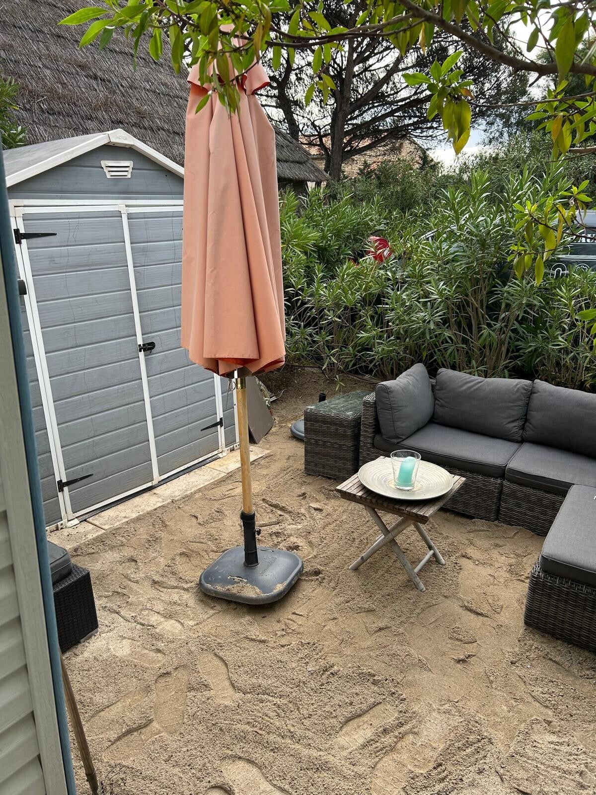 "Mobilhome Selma" equipped with 2 bedrooms, covered wooden terrace, oven, Nespresso, TV, large BBQ, sun beds, lounge set, washing machine, air conditioning and about 300 metres from the beach.